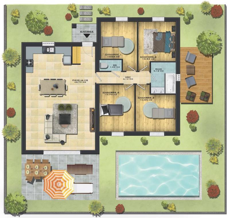 Le modèle DALHIA se compose d'une part d'un espace jour avec une grande pièce de vie de 47M2 et d'autre part d'un espace nuit avec 4 chambres , une salle de bains et des WC séparés.