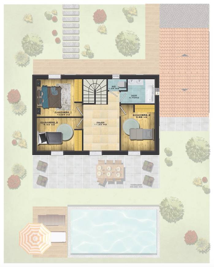 il est modulable en terme de surface ainsi qu'en nombre de chambres et on peut y ajouter des annexes comme un garage ou une terrasse.