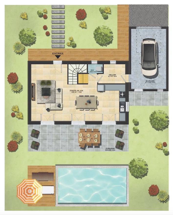 Au RDC du modèle FUSCHIA on trouve une grande pièce de vie avec cuisine ouverte d'environ 45M2 ainsi qu'un cellier et des toilettes.