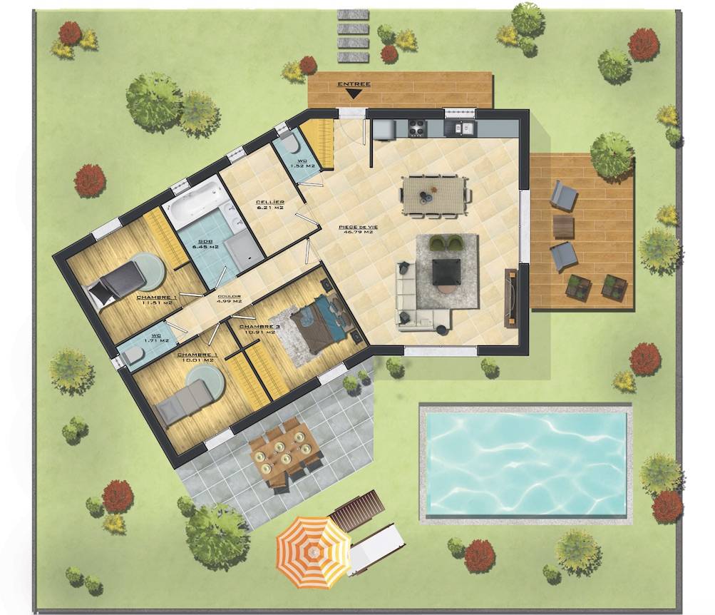 Le modèle LILA se compose d'une part d'un espace jour avec une grande pièce de vie de 47M2, un cellier de 6M2 et un WC, et d'autre part d'un espace nuit avec 3 chambres , une salle de bains et des WC séparés.