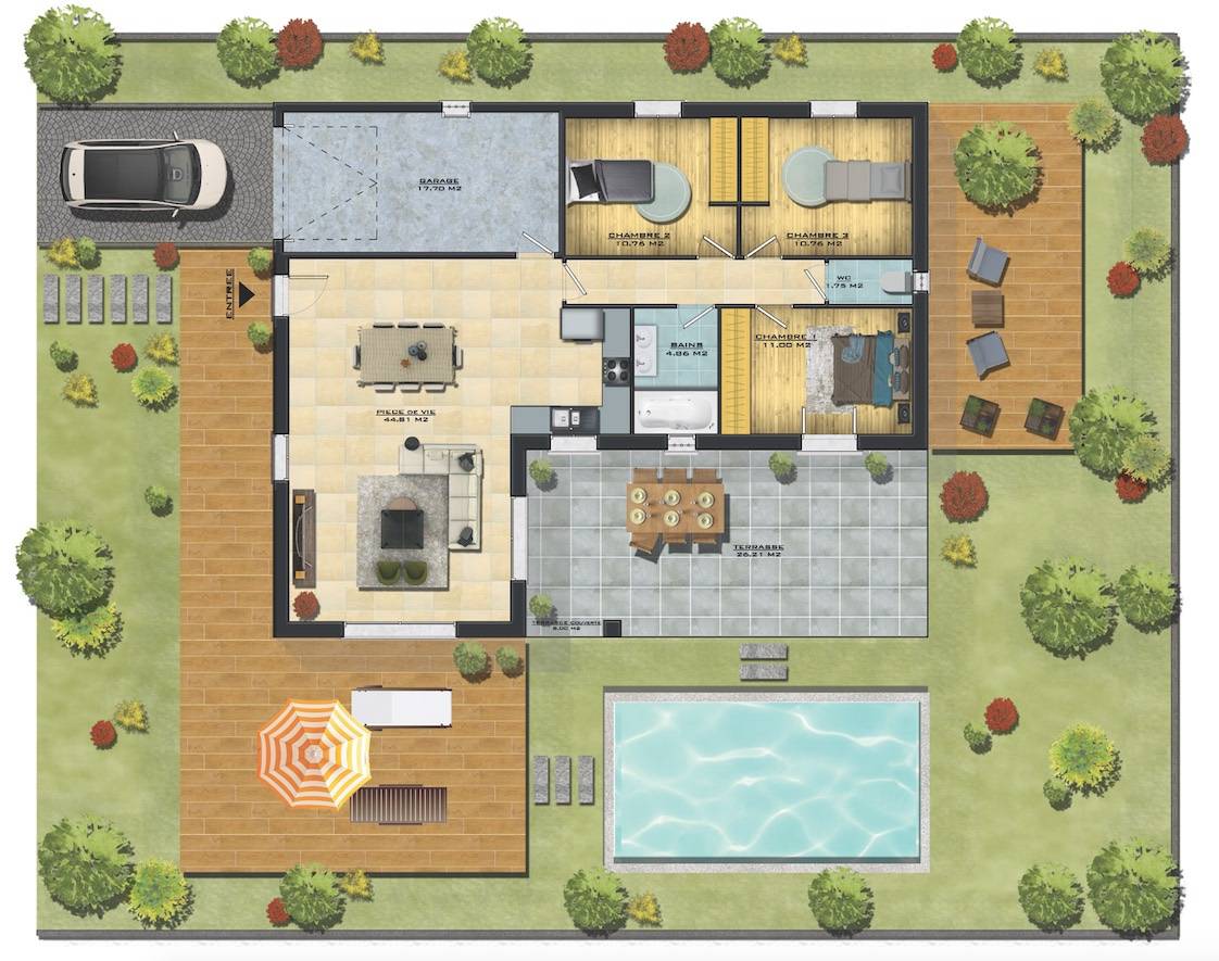 Le modèle MAGNOLIA, configuré en "L", se compose d'une grande pièce de vie de 45M2, 3 chambres, une salle de bains, un WC séparé, et d'un garage intégré.