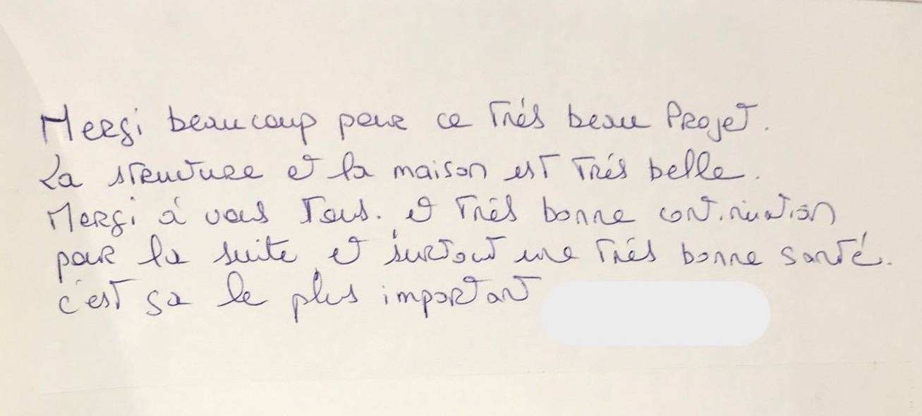 "Merci beaucoup pour ce très beau projet. La structure de la maison est très belle. Merci à vous tous et très bonne continuation pour la suite et surtout une très bonne santé, c'est ça le plus important. " Monsieur C. (extrait de notre livre d'or)