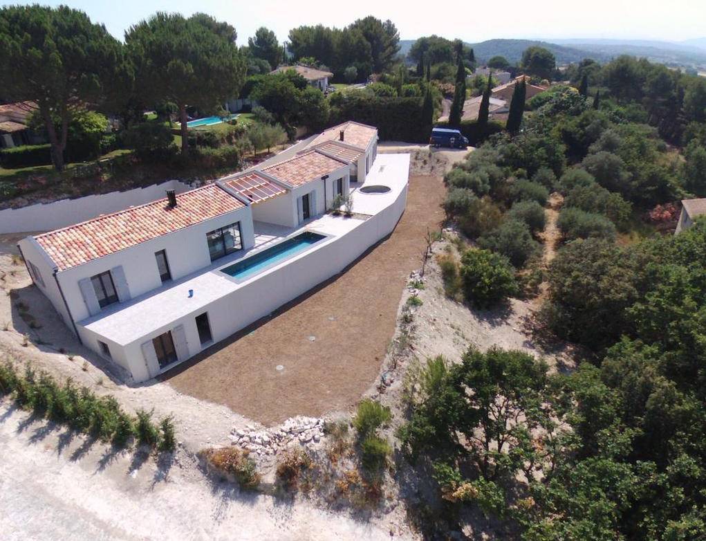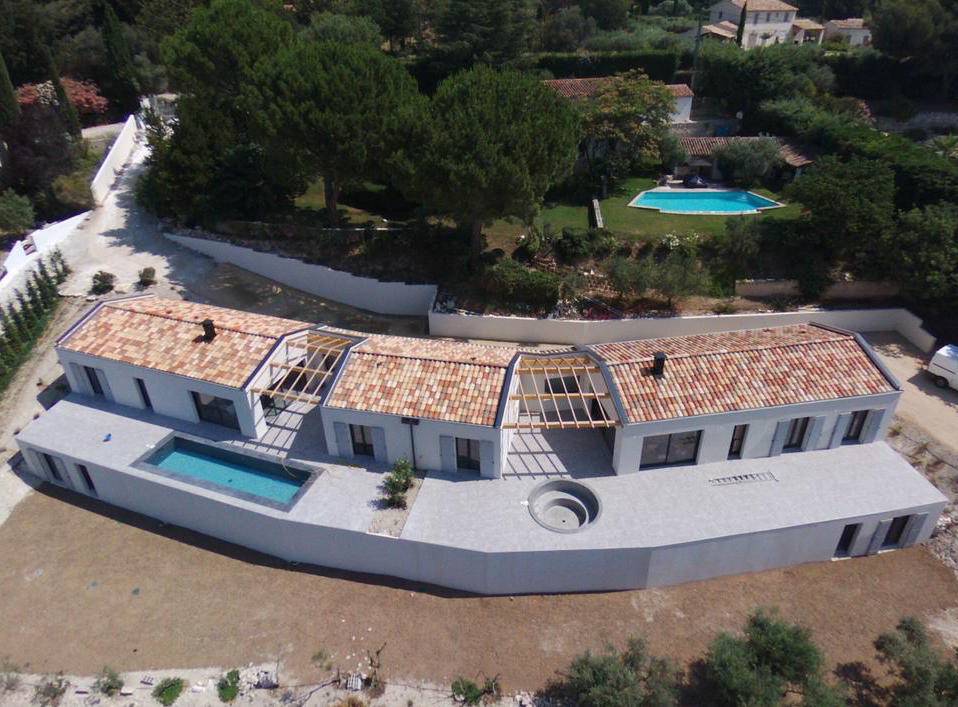Azur Logement Provencal a réalisé pour son client d'Eguilles, deux magnifiques villas de plain pied contemporaines liées par leurs toitures traditionnelles et leurs pergolas.